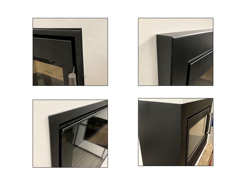Wenn Sie neu bauen, können Sie einen Standardrahmen wählen. Wenn Sie jedoch ein vorhandenes Ziegelloch in der Wand haben, können wir den Rahmen auch nach Ihren Wünschen anpassen. Soll der Einbaukaminofen bündig mit der Wand sein oder wie ein Gemälde ein wenig aus der Wand herausragen?